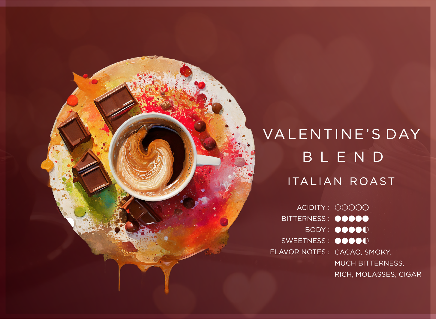 バレンタインといえばチョコレート。そのチョコレートと最も相性の良い味わいを考慮し、「苦み」と「コク」、「甘み」を最大限に引き出すため「イタリアンロースト」という一番深い焙煎度合で仕上げてみました。